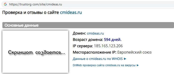 Проверка веб-портала конторы Центр Современных Идей на trustorg com показала, что возраст домена к моменту написания статьи составляет 594 дня, вероятно домен купленный.