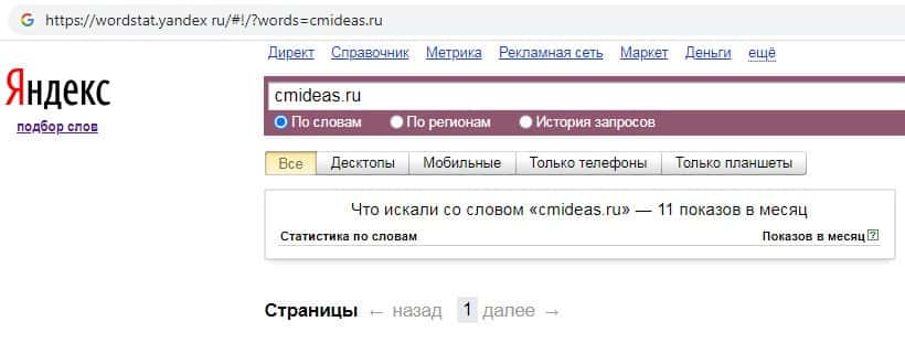 Количество запросов по бренду названия домена компании "cmideas.ru" в поисковике Яндекс составило 11 запросов за месяц.