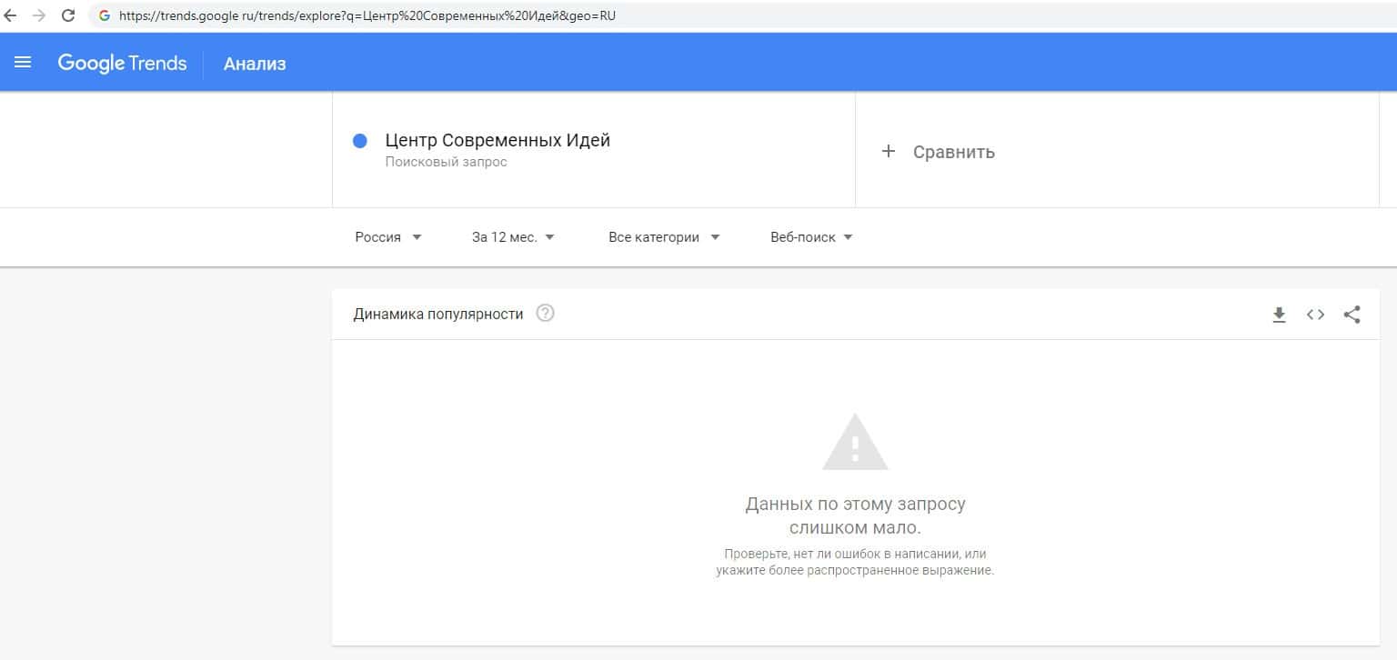 Количество запросов по бренду полного названия компании на русском языке "Центр Современных Идей" на Гугл Трендс вероятно равно нулю.