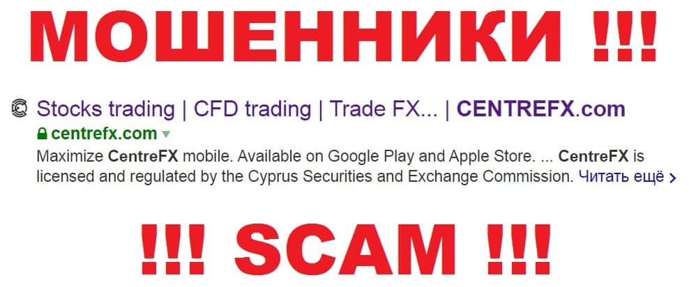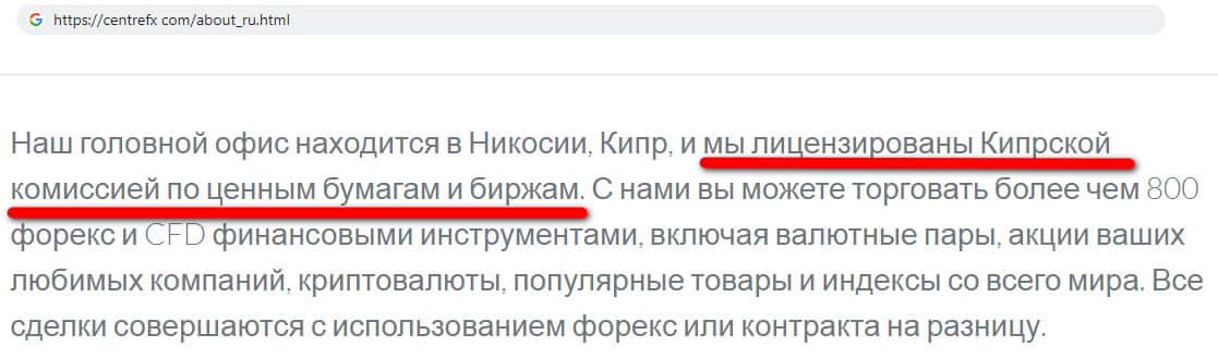 Компания финансовых мошенников CentreFX указала, что зарегистрирована на Кипре, что в свою очередь является оффшорной зоной, которой часто пользуются мошенники. Так же фирма указала, что регулируется Кипрской комиссией по ценным бумагам, но вот только скорее всего нет никакого регулирования а так же регистрации.