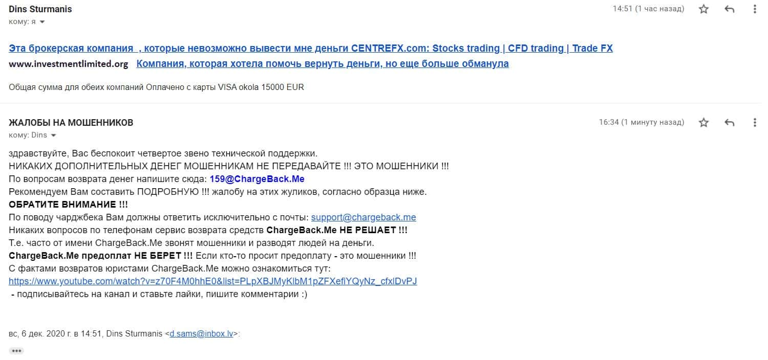 - Жалоба на жульнические компании ЦентрФХ и Инвестмент Лимитед - клиент лишился 15 тысяч евро