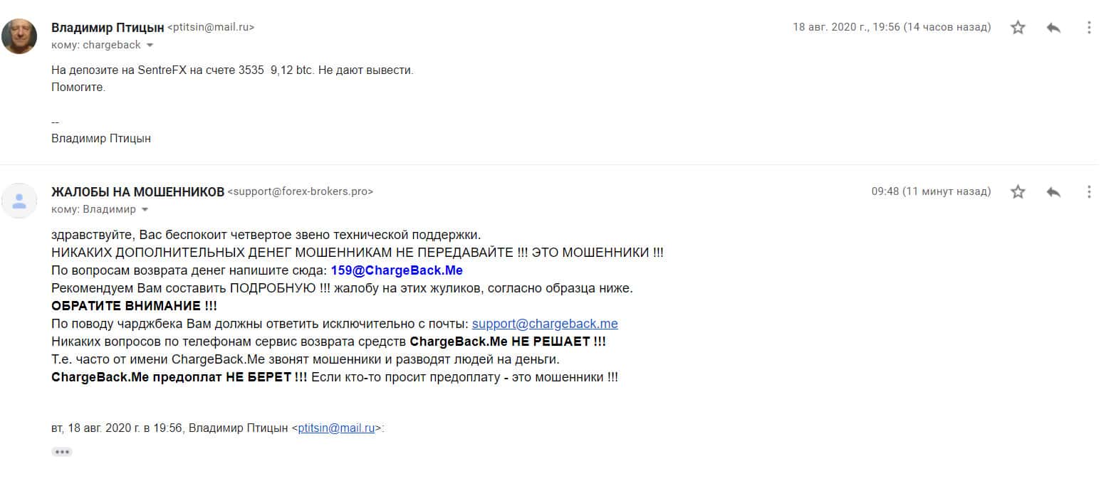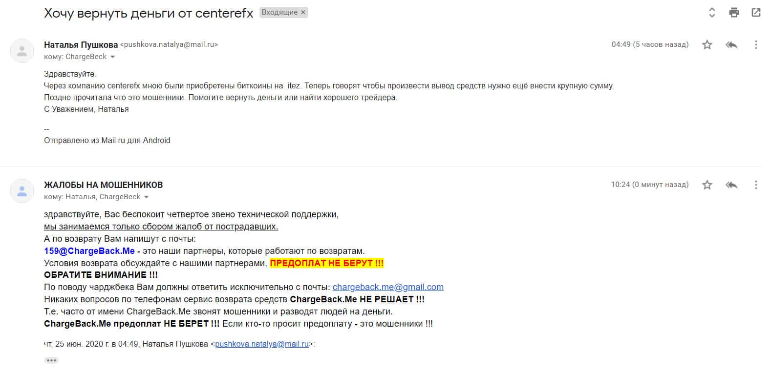 Мы проверили существование адреса электронной почты мошеннической организации Центре ФХ. Такой адрес действительно существует, но вот если верить всем отзывам, то компания просто напросто игнорирует своих клиентов и не отвечает на письма пользователей.