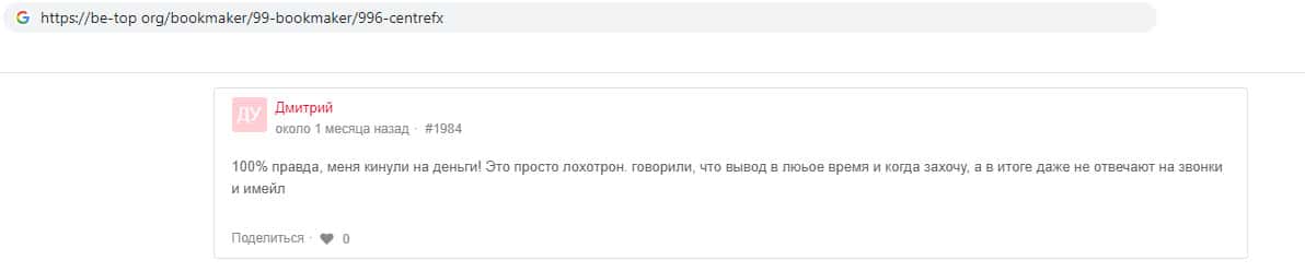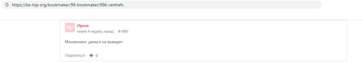 Если лохотронщики CentreFX обманули Вас, то тогда не позвольте, чтоб мошенники Центре ФХ продолжали дальше обманывать точно таких же доверчивых людей как Вы, не забывайте делиться личным печальным опытом.