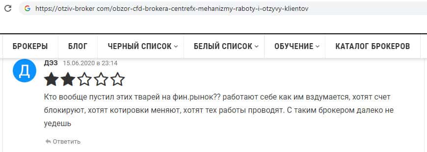 На интернет ресурсе otziv-broker com мы нашли статью о компании кидал CentreFX, в которой говорится о том, что отрицательной информации о компании набралось большое количество, и этого хватит для того, что бы поместить псевдоброкера в чёрный список. Сайт категорически не рекомендует сотрудничать с данным лжеброкером.