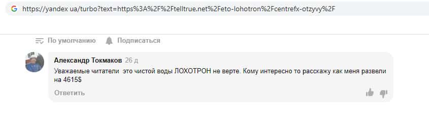 Вот один из немногочисленных отзывов о компании кидал CentreFX. В нём пользователь рассказал, что компания кидал развела его на 4615 долларов. Пользователь добавил, что может подробно рассказать как его обманули, для этого нужно написать лично ему. И таких обманутых пользователей очень и очень много, ведь компания существует что бы разводить людей.