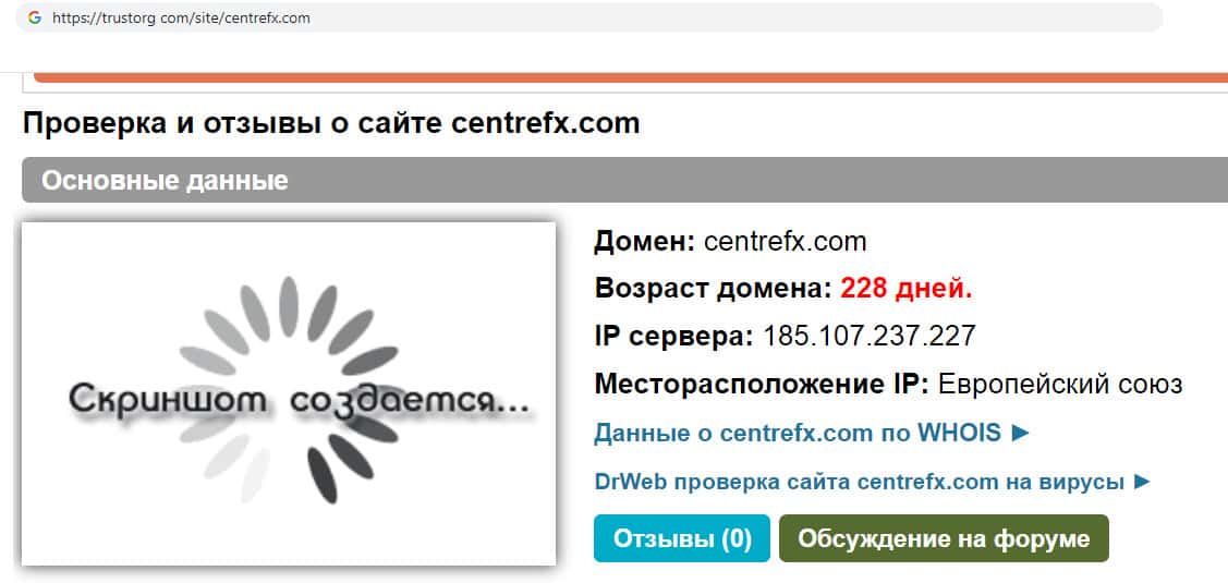 Мы проверили сайт компании CentreFX через интернет ресурс "Доверие в Сети". Оказалось что компания существует менее года, хотя на главном сайте компании указанно, что она основана в 2016 году. Получается что фирма просто напросто врёт о возрасте, что бы хоть как то повысить свою репутацию среди пользователей.