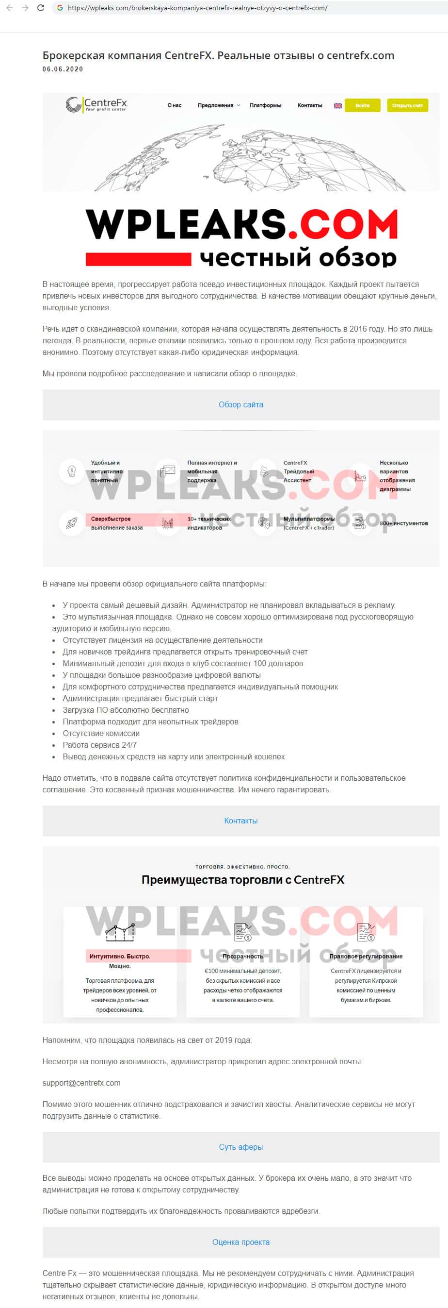 Интернет ресурс wpleaks com опубликовал на своём сайте статью о компании финансовых мошенников CentreFX. в статье компания рассказала в чём компания врёт своим клиентам. Так же сайт рассказал о том, что мошенники скрывают статистические данные и юридическую информацию. Сайт напомнил о том, что в сети множество отрицательных отзывов о фирме.