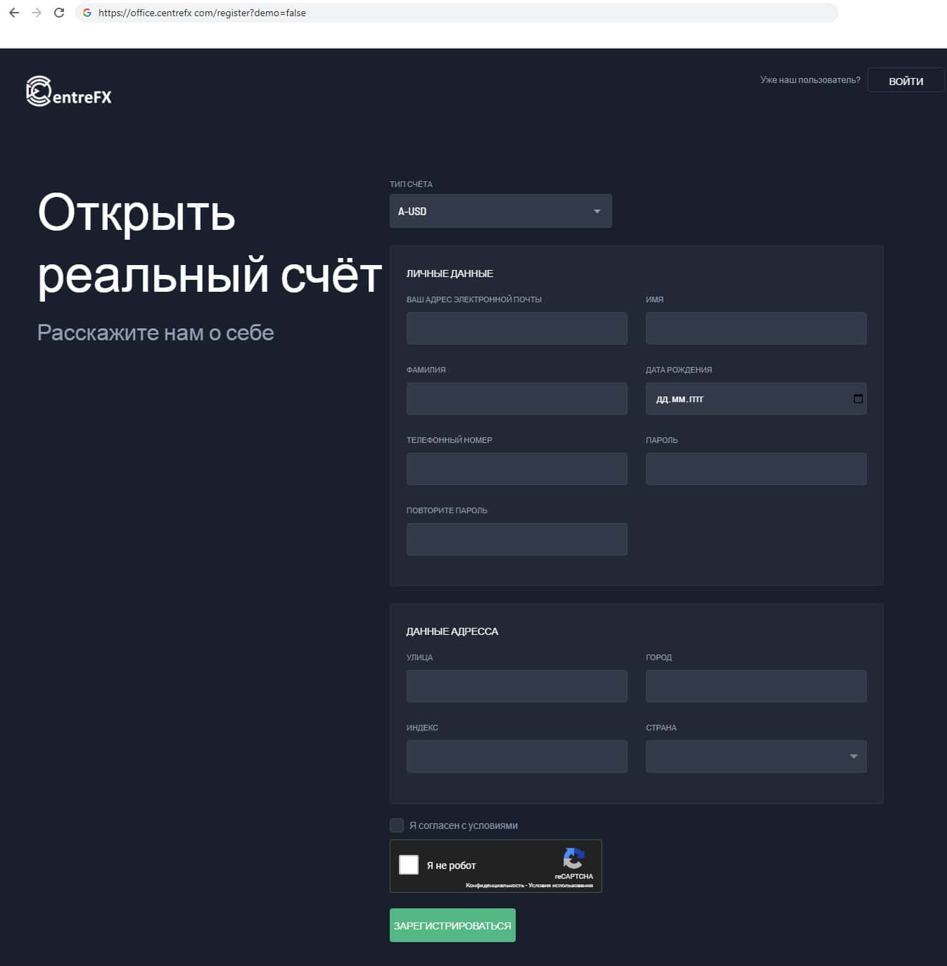 Для того, что бы открыть счёт в компании кидал CentreFX необходимо пройти процедуру регистрации, для этого нужно указать свои данные, а так же данные местоположения, номер телефона а так же адрес. Но указывать можно что угодно, так как компания это не проверяет. Можно ввести просто набор букв, для компании главное что бы вы внесли деньги.