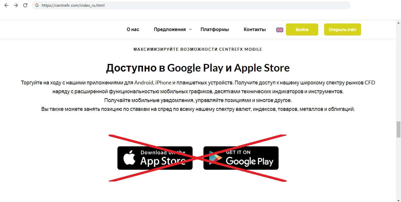 Не забыли мошенники Центре ФХ и о мобильном приложении. Фирма указала на сайте, что их платформа доступна и для мобильных устройств, и выложила ссылки на приложения. Но если пройти по этим ссылкам, то вы попадёте на главную страницу сервиса для смартфонов, так как никакого мобильного приложения не существует.