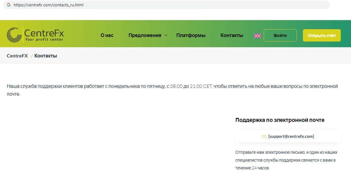 Для того что бы пользователи могли связаться с фирмой аферистов Центре ФХ, жулики указали контактные данные, которые состоят всего их одного адреса электронной почты. Но брокерская компания по всем законам должна указывать и адрес офиса а так же контактный номер телефона, в ином случае компания является незаконной. Контакты мошенников: