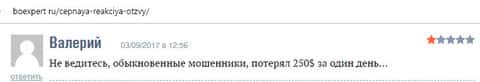 Еще в одной статье о мошенниках Chain-Reaction Pro указано, что это реальная ловушка для каждого, где жулики будут требовать деньги. Вся их схема рассчитана на выманивание первого депозита в 250 долларов, а потом как карта ляжет, в зависимости от широты кармана жертвы.