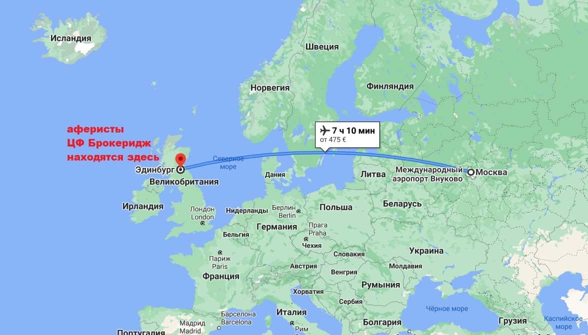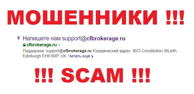 На сайте псевдорегулятора CFBrokerage Ru мы видим фальшивый адрес офиса, где якобы располагается шарашкина контора, это Эдинбург, Великобритания.