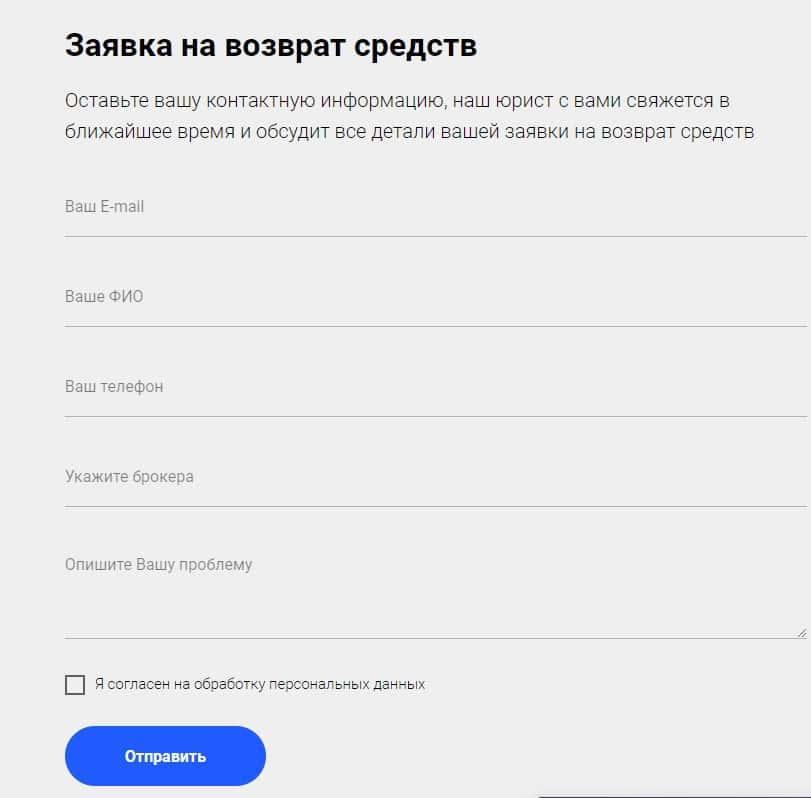 Также для связи с организаторами лохотрона имеется форма обратной связи в виде заявки на возврат средств, которую нужно заполнить, оставив жуликами свои личные данные.
