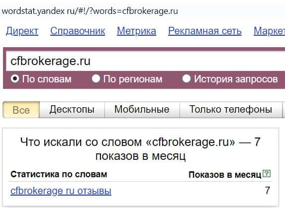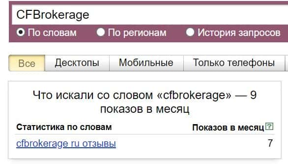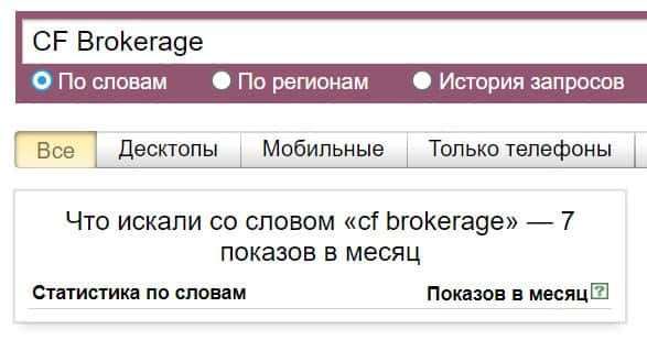 То же название "CF Brokerage", но написанное с пробелом, люди пытались найти в системе Яндекс 7 раз.