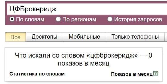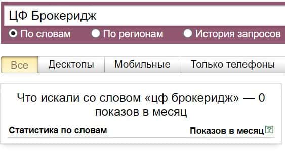 Посмотрим, сколько раз люди искали название бренда "ЦФ Брокеридж" на русском языке с пробелами: результат 0 показов.