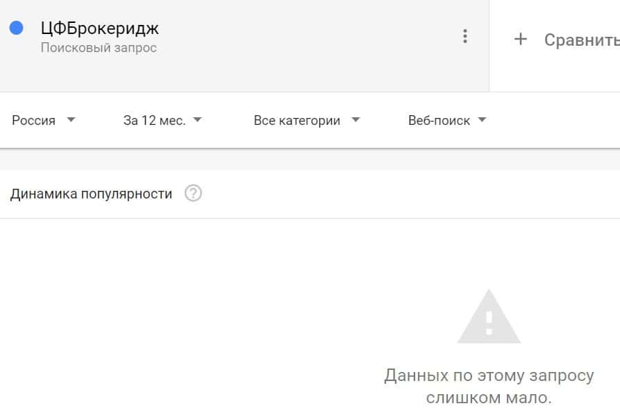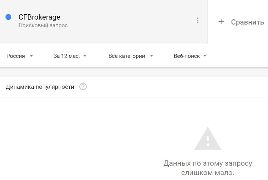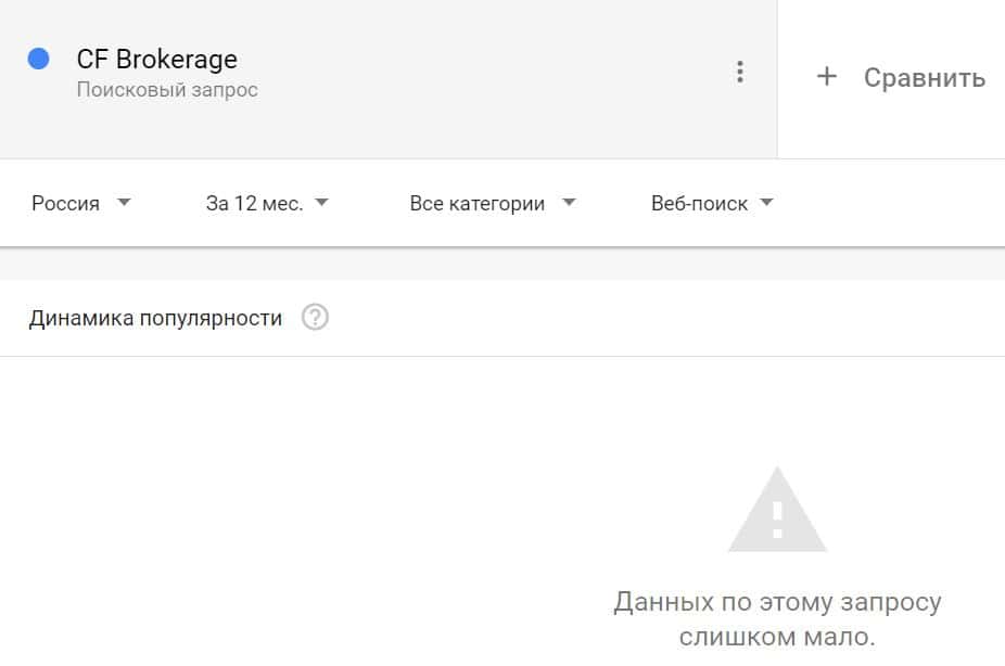 Посмотрим, насколько популярно название бренда "CFBrokerage", написанное на английском языке. Данных по этому запросу нет, так как никто не искал этот бренд в Гугл.
