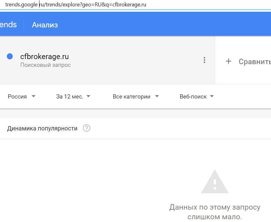 Доменное имя мошеннического сайта "cfbrokerage.ru" вбивали в поисковую систему Гугл слишком редко, поэтому данных по этому запросу практически нет.