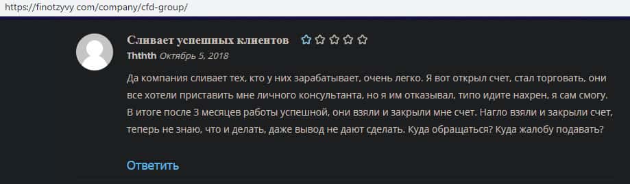 На изображении, расположенном ниже, вы можете увидеть и прочесть реальный негативный комментарий в сторону аферистов CFD Group, который связан с тем, что шулера ЦФД Групп попросту нагло опрокинули наивного пользователя сети интернет, а вернее жулье CFD Group нагло заблокировали аккаунт клиента оставив его без денег.