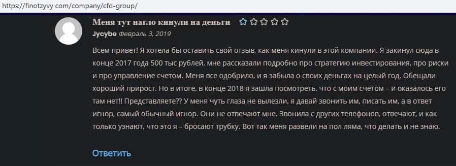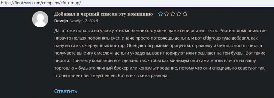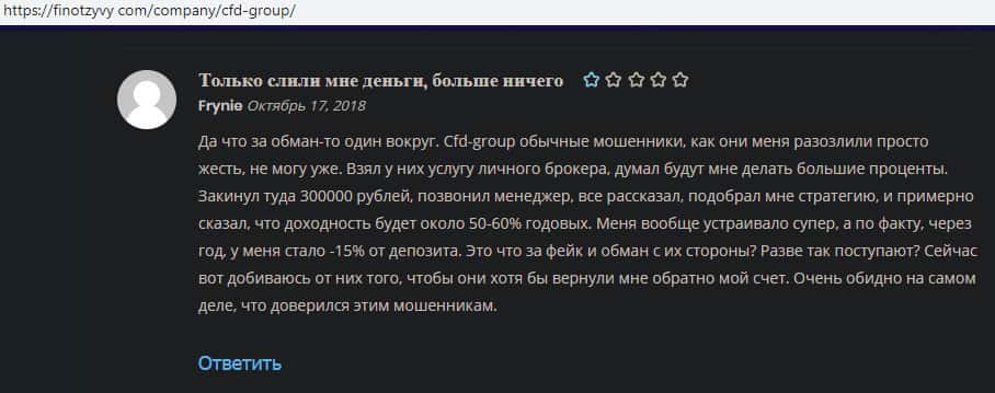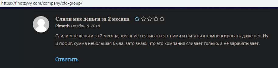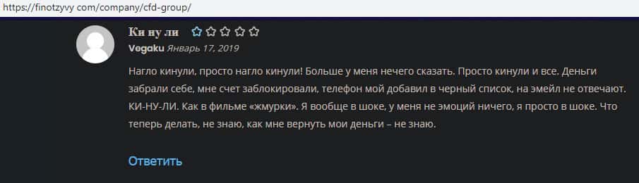 На изображении, расположенном ниже, вы можете увидеть еще один реальный негативный отзыв в сторону аферистов CFD Group, который связан с тем, что мошенники ЦФД Групп довольно нагло и банально опрокинули очередного пользователя сети интернет на деньги, после чего оперативно дали заднюю и отказались отвечать за свои действия.