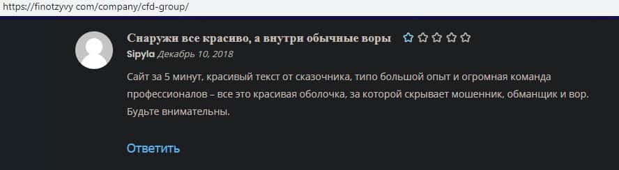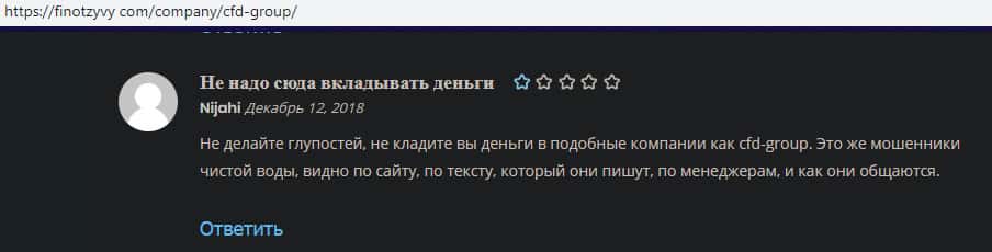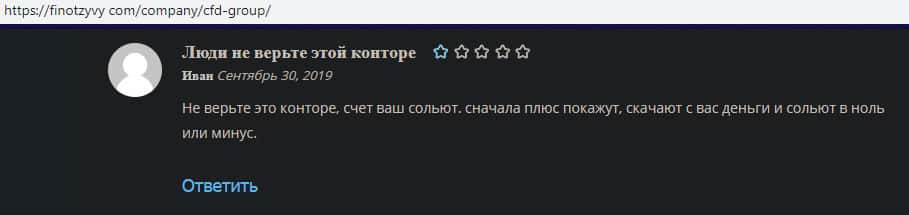 На изображении, расположенном ниже, вы можете увидеть очередной реальный отзыв в сторону лохотрона ЦФД Групп, который связан с тем, что пользователь не рекомендует иметь дело с шулерами CFD Group, так как это банальный развод наивной клиентуры на деньги, в ходе которого мошенники ЦФД Групп отказываются от любой ответственности.