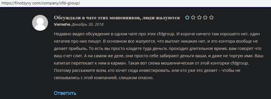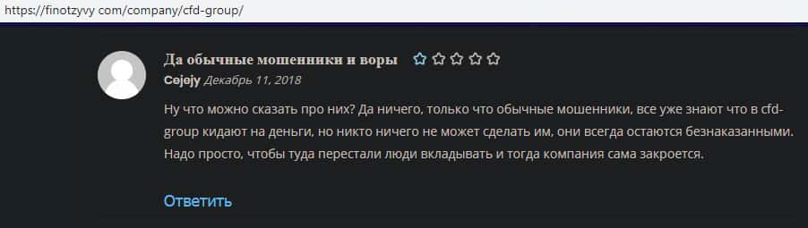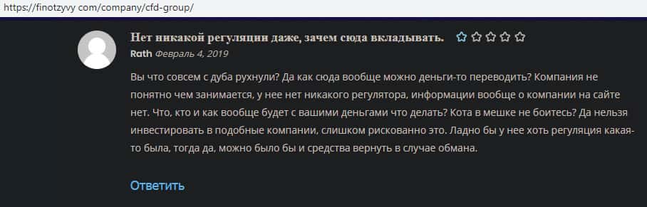 На изображении, расположенном ниже, вы можете наглядно увидеть и прочесть еще один реальный негативный комментарий в сторону аферистов CFD Group, который связан с тем, что шулера ЦФД Групп занимаются исключительно разводом клиентуры под выдуманными предлогами и не имеют никакой регуляции, хотя все же врут об обратном.