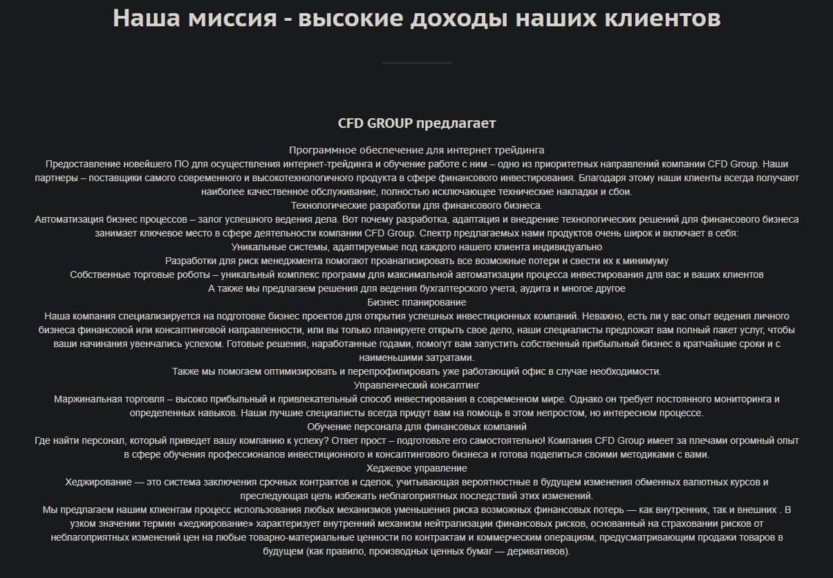 После на подвальном сайте аферистов CFD Group следует довольно типичный и банальный раздел с довольно сомнительными услугами мошенников ЦФД Групп, под предлогом которых они пытаются навязать свою контору. На изображении, расположенном ниже, вы можете увидеть данный раздел сайта жуликов CFD Group.