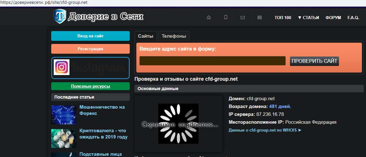 В связи с мошеннической и противозаконной деятельностью лохотрона CFD Group его реальные руководители предпочитают анонимность дабы избежать ответственности со стороны правоохранительных органов. Техническую же информацию о сайте мошенников ЦФД Групп можно узнать с помощью портала довериевсети рф, что вы можете увидеть ниже.