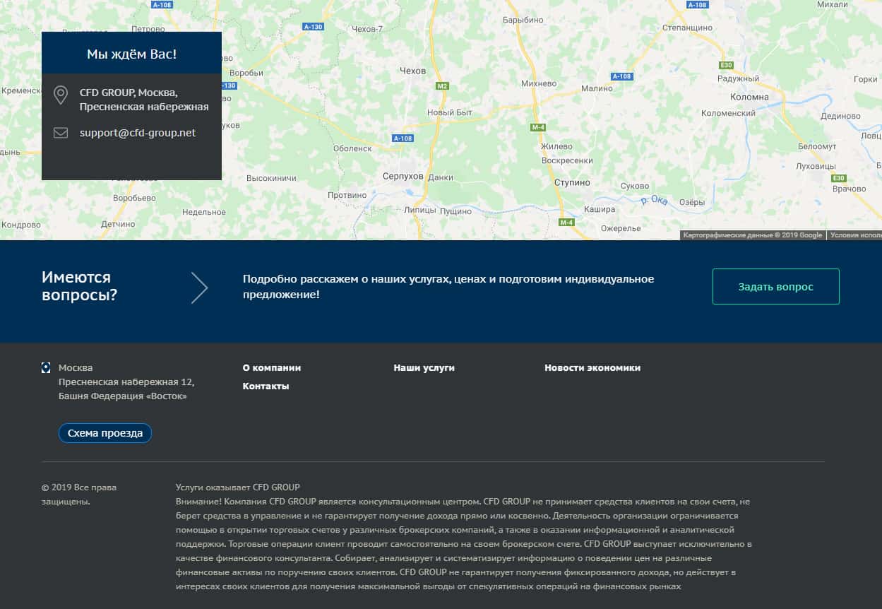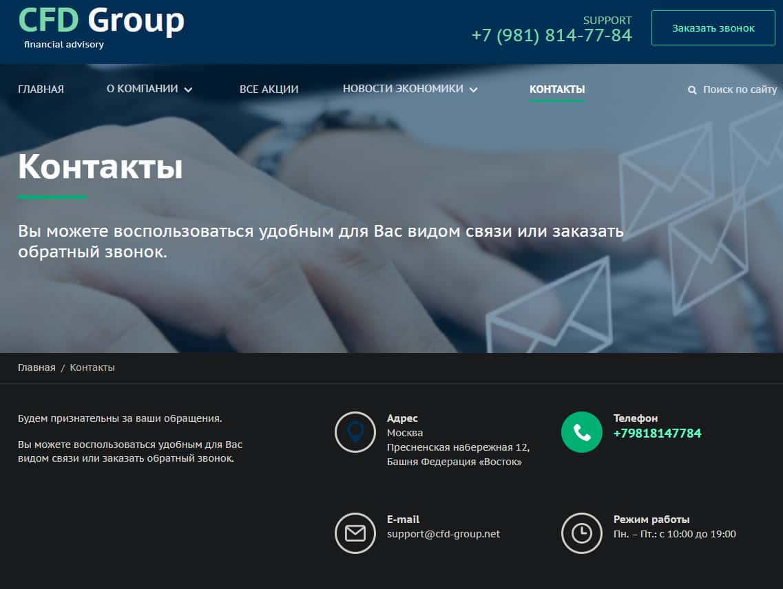 Под свои контакты жулики CFD Group отвели отдельный раздел своего подвального сайта, в котором перечислили крайне мало своих контактов, что говорит об явной халтуре проходимцев ЦФД Групп, которые попросту банально не хотят тратиться на обслуживание контактов и связь с клиентами. Итак ниже перечислим контакты аферистов CFD Group: