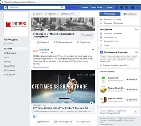 Дабы соответствовать всем современным трендам аферисты ЦФД Таймс решили обзавестись страницами в социальных сетях, одной из которых стал Facebook. Сразу отметим, что на страницу лохотрона CFDTimes подписано около двух тысяч человек, однако активности на постах абсолютно никакой нету. К тому же сами посты у шулеров ЦФД Таймс выходят довольно редко.