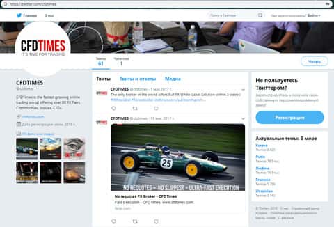 Аналогично обстоит ситуация у аферистов ЦФД Таймс в социальной сети Twitter, в которой у мошенников CFDTimes уже нету читателей, однако и активность на странице точно такая же как в предыдущей социальной сети, а именно никакая. На изображении, расположенном ниже, вы можете увидеть страницу шулеров ЦФД Таймс в социальной сети Твиттер.