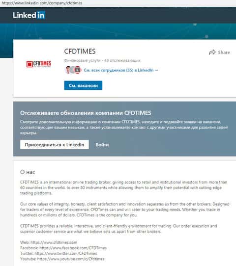 Имеется у лохотрона ЦФД Таймс и страница в социальной сети Линкед Ин, в которой мошенники CFDTimes опубликовали информацию о себе, дабы непосредственные клиенты данного лохотрона действительно поверили в реальность работы жуликов ЦФД Таймс. Ну а по-факту сделано это мошенниками CFDTimes исключительно для виду, и это очередная лапша.