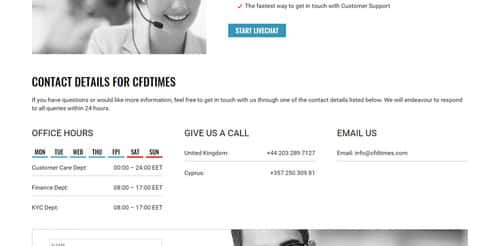 Хоть мошенники CFDTimes и отвели под контакты отдельный раздел, однако самих контактов у мошенников ЦФД Таймс крайне мало. К тому же у шулеров CFDTimes не указаны адреса офисов, что говорит о финансовой ограниченности лохотрона ЦФД Таймс. Контакты лохотрона CFDTimes, расположенные у них на сайте, перечислим ниже: