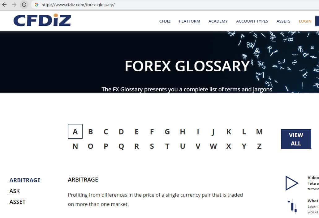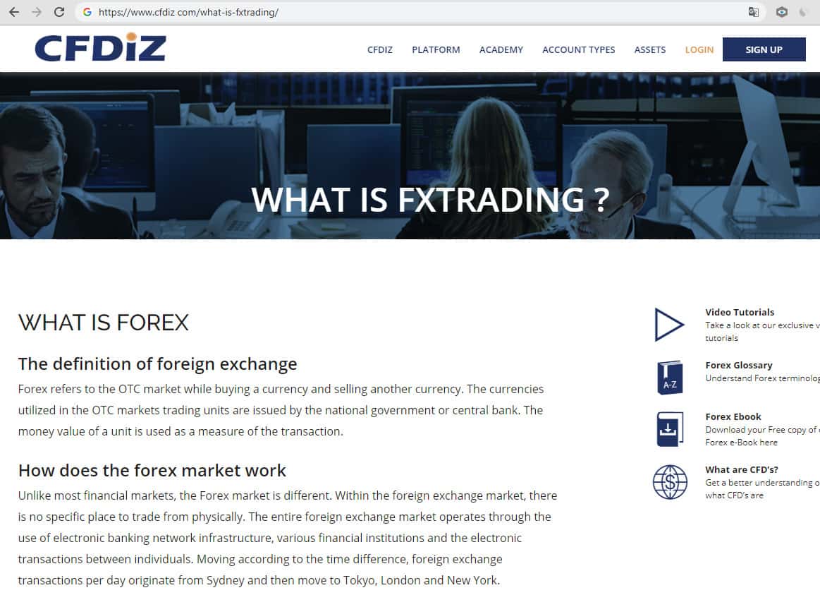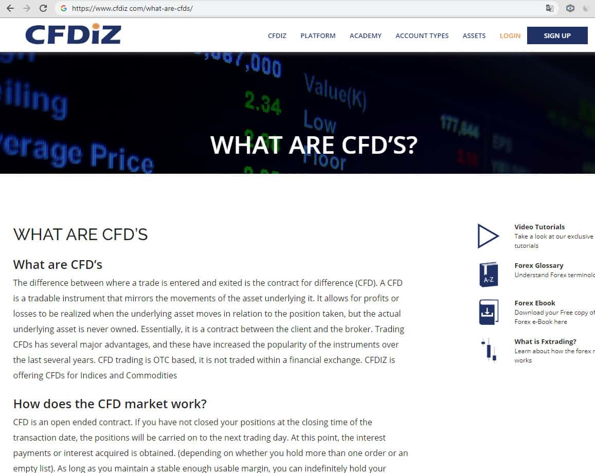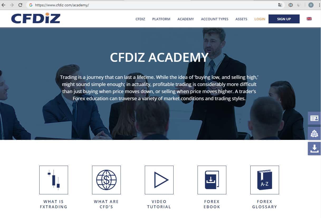 Поднимая планку солидного брокерского портала, или же, чтобы иметь возможность претендовать на солидность, аферисты ЦФДИЗ разместили на своём портале раздел, посвященный обучению новичков в мире финансовой торговли, гордо именуемый Academy. Он содержит 5 подразделов: о форекс, о CFD, видеоруководство, электронные книги и глоссарий.