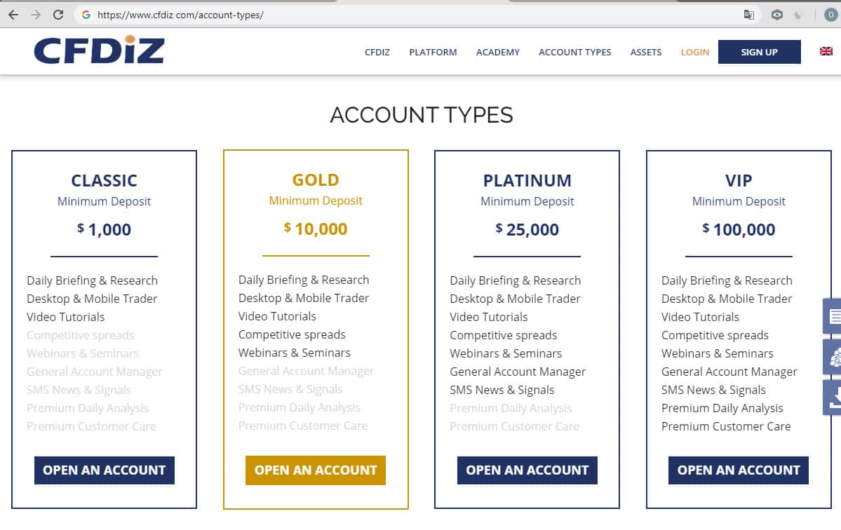- Типы аккаунтов трейдеров на торговой площадке CFDIZ