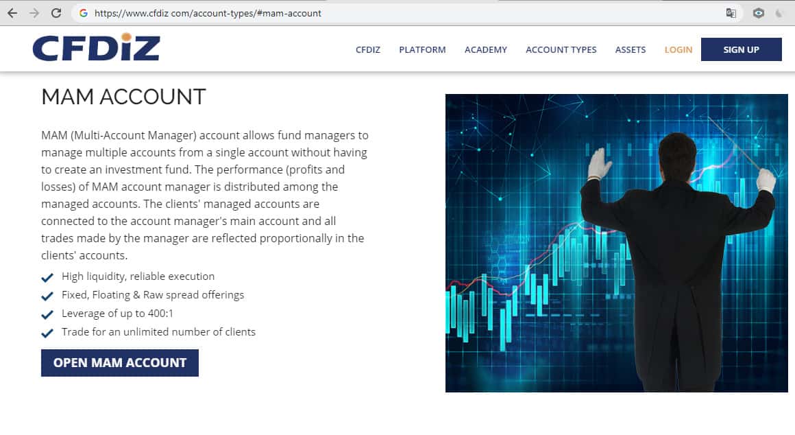 Торговая площадка ЦФДИЗ разрешает открывать и учетные записи MAM (Multi-Account Manager), которые позволяют управлять несколькими учетными записями с одного аккаунта без создания инвестиционного фонда. При этом прибыль и убытки, полученные в результате сделок. проведенных MAM аккаунт-менеджером отражается на всех управляемых им счетах.