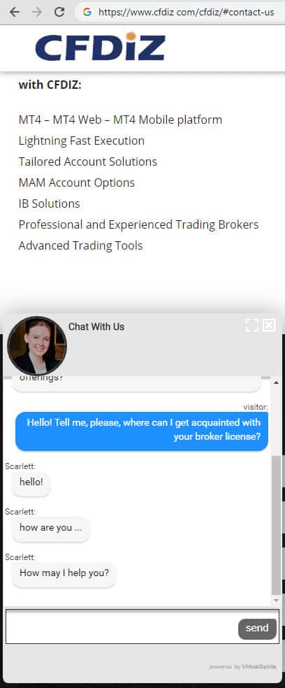 Рассмотрим возможности связи с администрацией и технической поддержкой брокерской конторы ЦФДИЗ. Для получения непосредственной консультации в режиме реального времени на портале компании указан контактный телефон, якобы расположенный в Великобритании. Но, на проверку, оказывается, что данный телефонный номер фейковый и дозвониться по нему не получится.