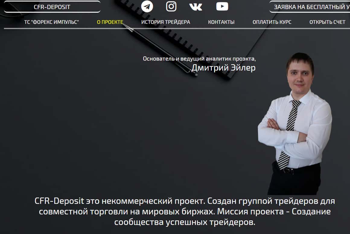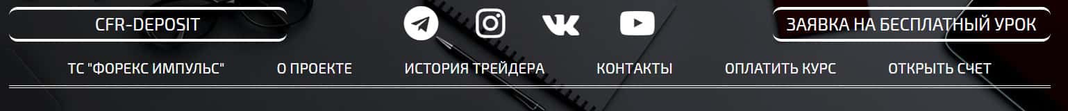 Начинается подвальный сайт у аферистов ЦФР Депозит с довольно банальной и кривой шапки сайта, которая содержит в себе перечень ссылок на различные разделы подвального сайта мошенников CFR-Deposit, а так же ссылки на их социальные сети. На изображении, расположенном ниже, вы можете наглядно увидеть начало сайта.
