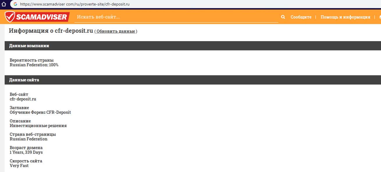 scamadviser com - сайт с технической информацией о лохотроне CFR-Deposit