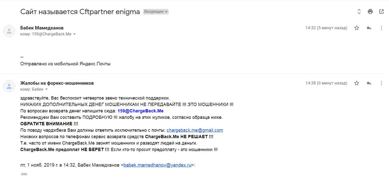 В следующем письме указано, что лохотрон CFT-Partner меняет постоянно сайты и даже бывает работает под другим названием. Жулье еще себя называет Enigma, где отрабатывают клиентов по все тем же старым схемам. Кинуто уже много людей и автор жалобы считает, что пора прикрыть их шарашкину контору.