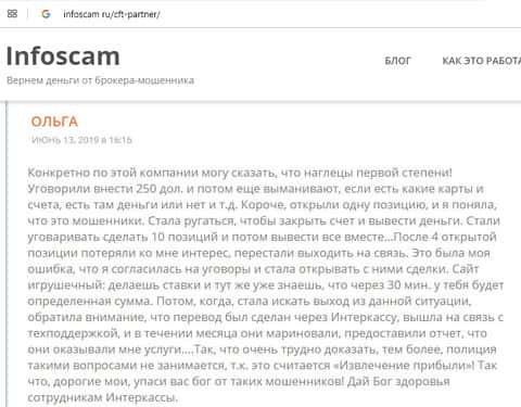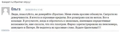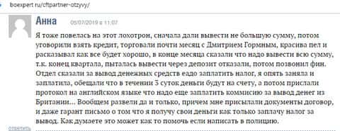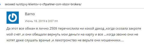 В подтверждения предположений о мошеннической деятельности конторы CFT-Partner представлен следующий отзыв, в котором женщина лично перечислила 250 долларов на торговый счет, открытый там. После того, как она стала делать запросы на вывод средств, поддержка стала игнорировать ее звонки.