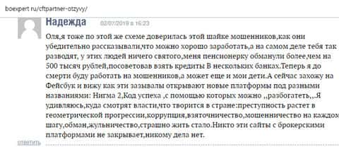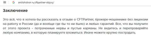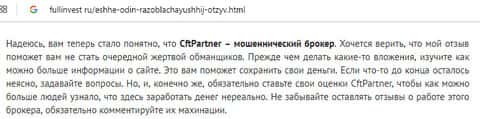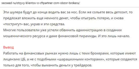 Вот еще один автор статьи такого же мнения как и мы, по поводу нечестной работы мошенников CFT-Partner. Жулики используют различные уловки обманывая клиентов. Все что вы можете получить от данного лохотрона - это потраченные нервы, деньги и время. Не ведитесь на жулье ЦФТ Партнер.