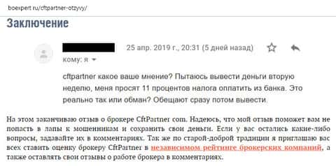 Жалоба на scam-контору CFT Partner - клиента развели на 11 000 долларов