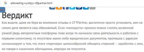 По выводу интернет-сайта, который сделал данный обзор, CFT-Partner - это мошеннический брокер, так как ведет нечестную игру со своими клиентами, которых в последующем делает дойными коровами для своего бизнеса. Автор статьи написал ее, чтобы по-меньше людей стало жертвой обмана.