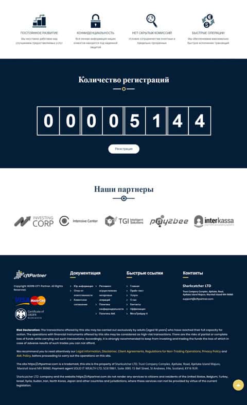 Касательно второй части сайта CFT-Partner так здесь конечно нет никаких оснований доверять данной шараге. За то количество времени, которое кухня работает - свыше 5000 регистраций это достаточно много, что сразу навевает сомнение на порядочность форекс-организации ЦФТ Парнер.