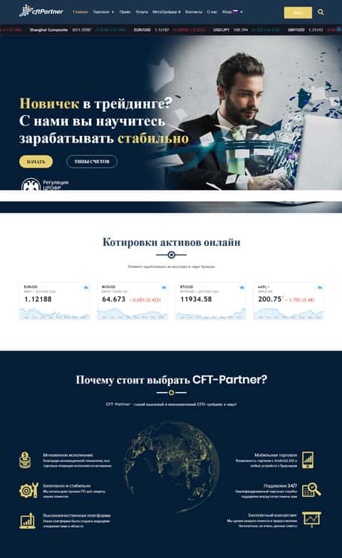 Сайт шулерской конторы CFT-Partner начинается с обычного завлекалова, по типу "открой счет и будет тебе счастье". Если не брать во внимание, что для начала нужно было определить основную информацию, согласно которой нормальный трейдер должен определить подходит ему или нет условия, то данная контора уже похожа больше на мошенников.