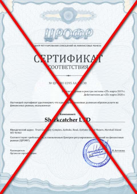 Согласно данным о регулировании, которое предоставляет контора ЦФТ Партнер своим клиентам в публичном доступе, на официальном сайте размещен сертификат соответствия ЦРОФР на имя компании Sharkcatcher LTD. На сайте упоминается, что якобы CFT-Partner от этой компании, но документально нигде не заверено, значит и лицензией просто пользуются в мошеннических схемах.