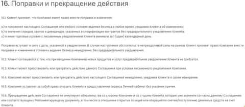 В данном разделе клиентского соглашения, которое предоставляется аферистами для подписания своим клиентам, есть определенный раздел - а именно Поправки и прекращение действия. Здесь указано несколько моментов из-за которых не следует связываться с CFT-Partner это - прекращение договора в одностороннем порядке и блокировка доступа к счету.