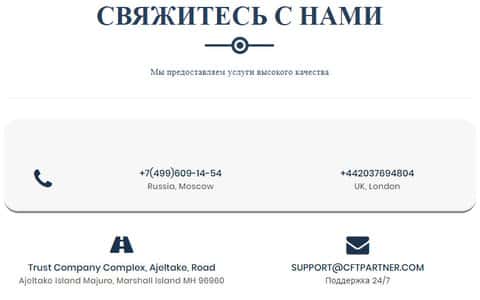 По поводу контактов, через которые можно связаться с жуликами CFT-Partner, здесь есть как телефонные номера, так и почта с адресом регистрации. Также стоит учитывать, что каким-то образом номер телефона попадает в Лондон, хотя нигде об этом говоре не упоминается. И все же представим все данные: