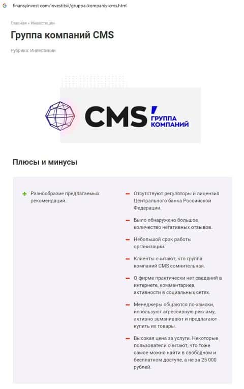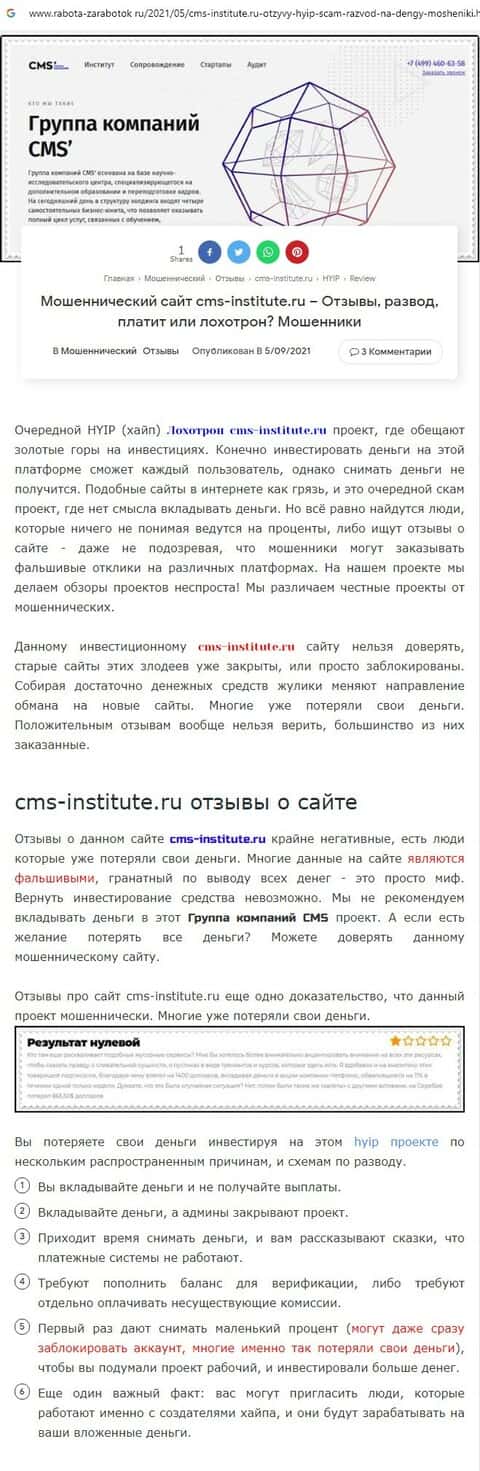 На скрине предоставленном ниже предлагаем ознакомиться с еще одной статьей-обзором о скам-проекте CMS-Institute, который предлагает псевдо-обучение торговле и инвестированию.