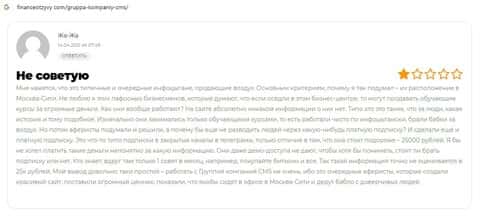 Автор ниже предоставленного отзыва разочаровалась в скам-конторе CMS Группа Компаний, поскольку зря потратила не только деньги, но и свое драгоценное время.
